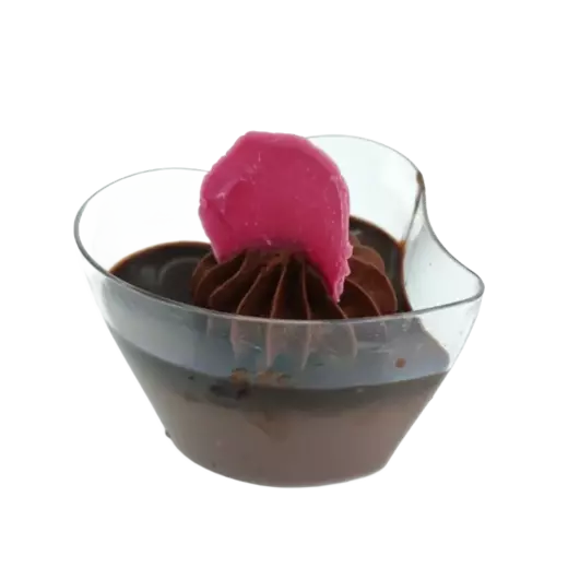 Čokoládová pěna přelitá čokoládovou ganáží, dozdobená čerstvým ovocem. Váha 80 g. Alergeny 6, 7 (sója, mléko).