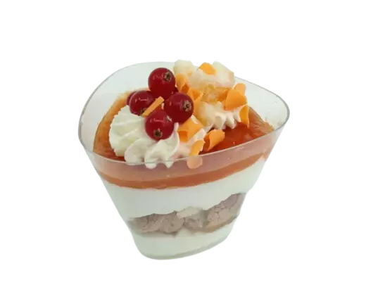 Kakaový korpus plněný pařížským krémem, zdobený čerstvým ovocem. Váha 22 g. Alergeny 1, 3, 6, 7 (lepek, vejce, sója, mléko). Alergeny 1, 3, 6, 7, 8 (lepek, vejce, sója, mléko, skořápkové plody).