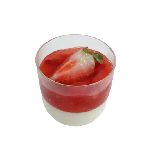 Smetanový dezert s vanilkou a jahodou, zdobený čerstvým ovocem. Váha 80 g. Alergeny 7 (mléko).