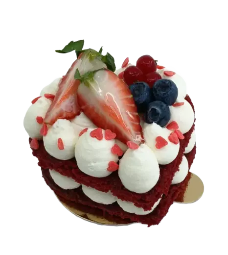 Vláčný sametový korpus z podmáslí a kakaa plněný jemným krémem z mascarpone a smetany, zdobený čerstvým ovocem. Alergeny 1, 3, 7 (lepek, vejce, mléko).