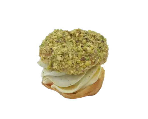 Francouzský dezert z odpalovaného těsta s křupavou krustou a lahodným pistáciovým krémem. Váha 90 g. Alergeny 1, 3, 7, 8 (lepek, vejce, mléko, skořápkové plody).