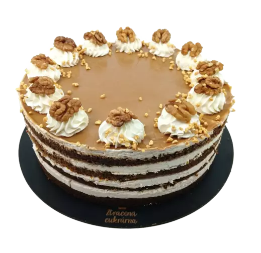Vláčný mrkvový korpus s vlašskými ořechy, prokládaný vrstvami smetanovo sýrového krému. Karamelová dekorace a čokoládové mrkvičky nebo vlašské ořechy. Velikost (průměr) dortu 24 cm. Váha cca 2000 g. Alergeny 1, 3, 7, 8 (lepek, vejce, mléko, skořápkové plody).