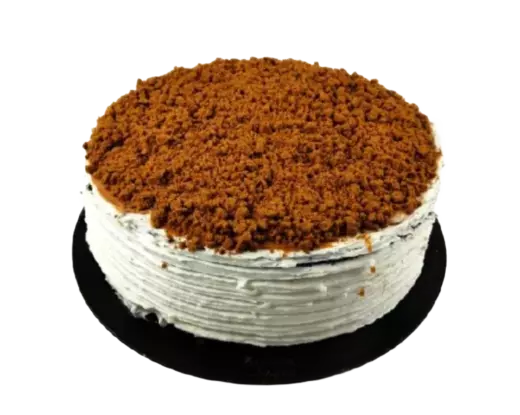 Křehký korpus z vanilkových sušenek, lahodný krém ze zakysané smetany a krémového sýru, zalitý polevou z karamelu a bílé čokolády, zdobený Lotus sušenkami. Velikost (průměr) dortu 26 cm. Váha cca 2600 g. Alergeny 1, 3, 6, 7 (lepek, vejce, sója, mléko).
