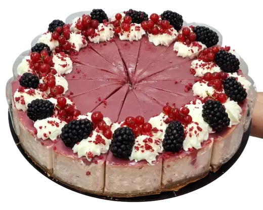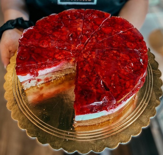 Křehký korpus z vanilkových sušenek, lahodný krém ze zakysané smetany, krémového sýru a malinového pyré, zdobený čerstvým ovocem. Velikost (průměr) dortu 26 cm. Váha cca 2600 g. Alergeny 1, 3, 7 (lepek, vejce, mléko).