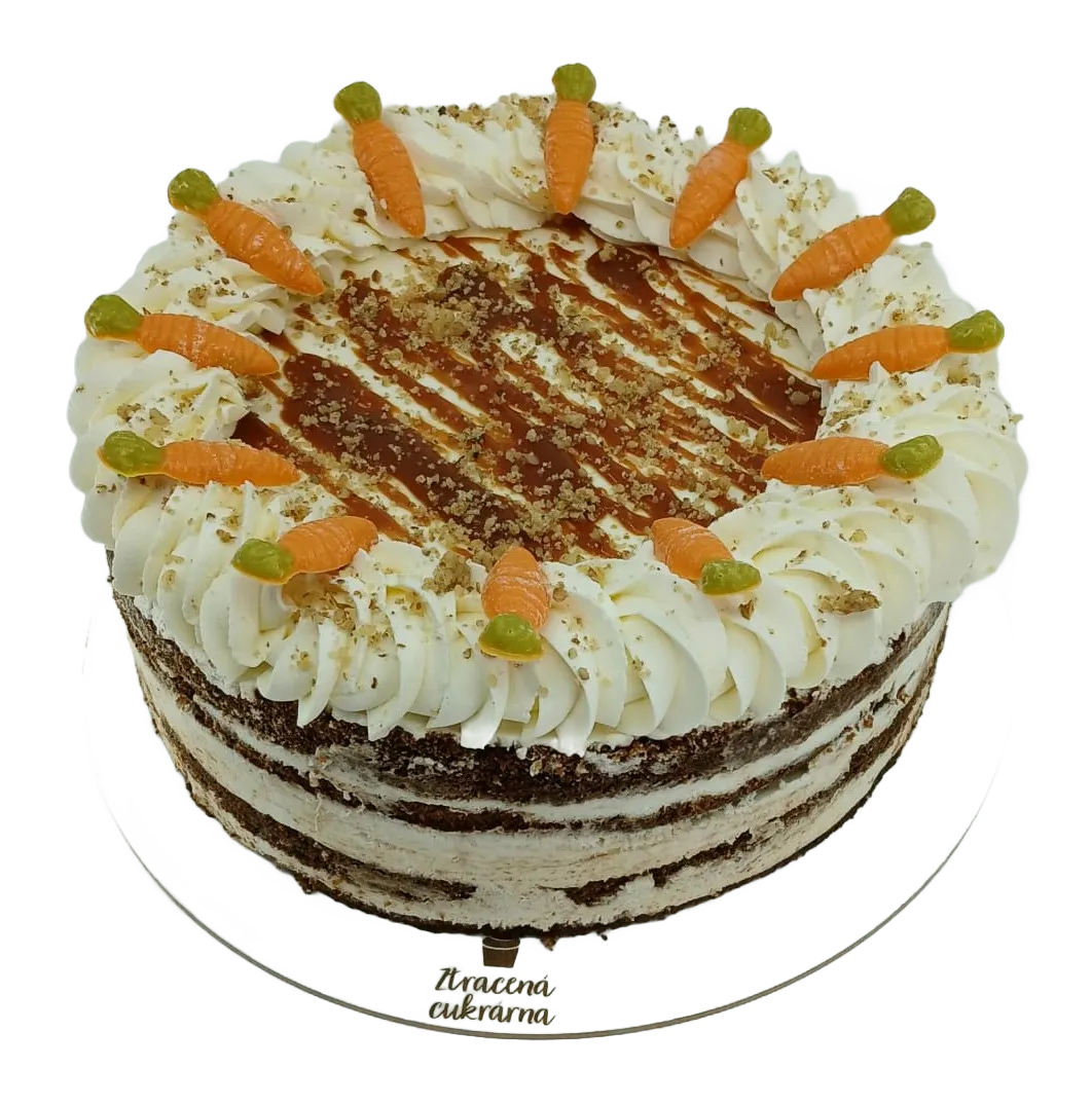 Vláčný mrkvový korpus s vlašskými ořechy, prokládaný vrstvami smetanovo sýrového krému. Karamelová dekorace a čokoládové mrkvičky nebo vlašské ořechy. Velikost (průměr) dortu 24 cm. Váha cca 2000 g. Alergeny 1, 3, 7, 8 (lepek, vejce, mléko, skořápkové plody).