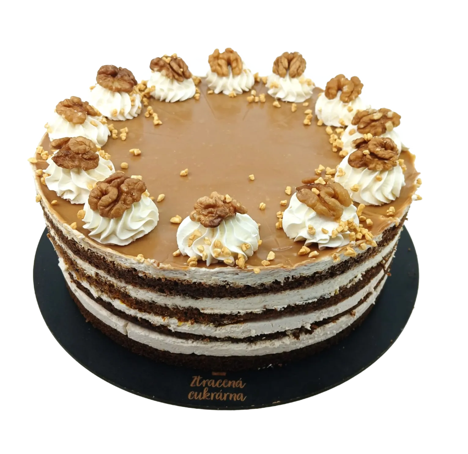 Nadýchaný dýňový korpus plněný smetanovým sýrem se skořicí. Politý karamelovou čokoládou, dozdobený vlašskými ořechy. Velikost (průměr) dortu 24 cm. Váha cca 1800 g. Alergeny 1, 3, 7, 8 (lepek, vejce, mléko, skořápkové plody).