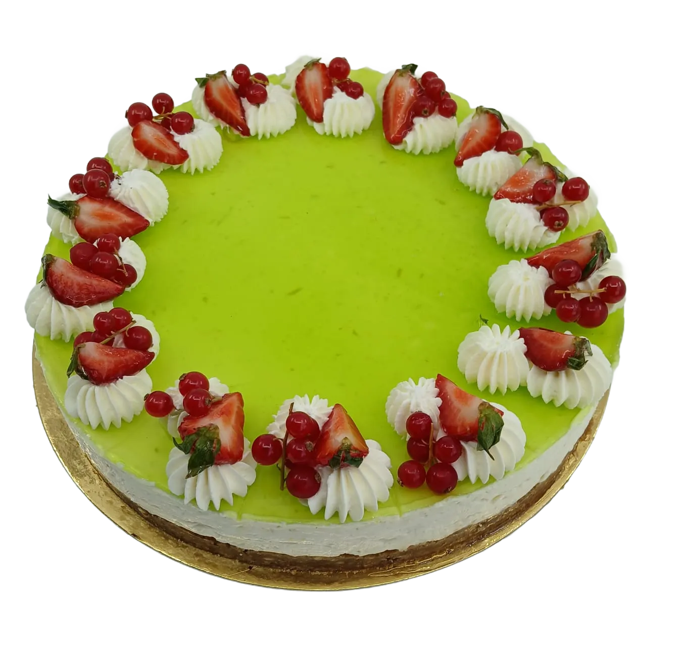 Křehký korpus z karamelových sušenek, lahodný krém ze smetany, krémového sýru a limetkového pyré, zdobený čerstvým ovocem. Velikost (průměr) dortu 26 cm. Váha cca 2400 g. Alergeny 1, 3, 6, 7 (lepek, vejce, sója, mléko).