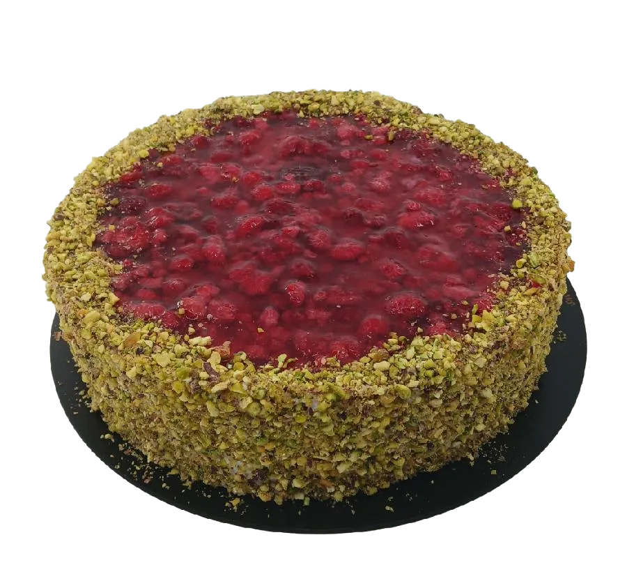 Kakaový korpus protřený malinovou marmeládou a plněný pařížskou šlehačkou. Posypaný malinami, …