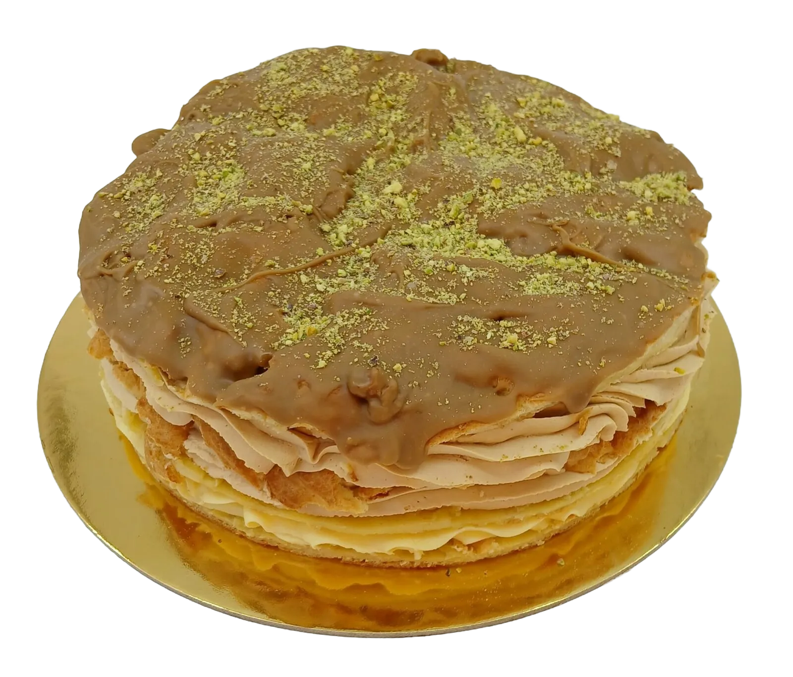 Odpalované těsto se žloutkovým krémem, karamelovou šlehačkou a cukrovo karamelovou polevou, zdobený mletými pistáciemi. Váha cca 2400 g. Alergeny 1, 3, 7, 8 (lepek, vejce, mléko, skořápkové plody).